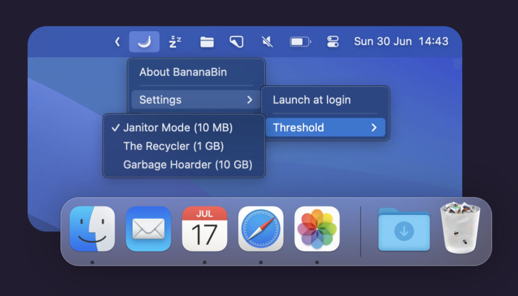 软件介绍:BananaBin Mac是一款用于 macOS 的有趣实用工具,当你的垃圾桶满了时,它会提醒你清理。这个软件通过在垃圾桶上添加互动的苍蝇来让你注意到垃圾桶的状态。你可以设置磁盘空间阈值,一旦达到,苍蝇就会出现并逐小时增加。清空垃圾桶或将鼠标悬停在上面可以吓走苍蝇。